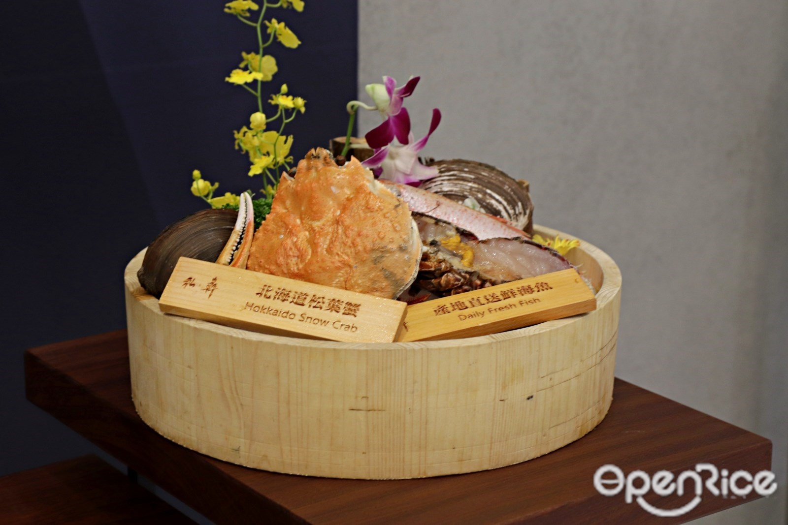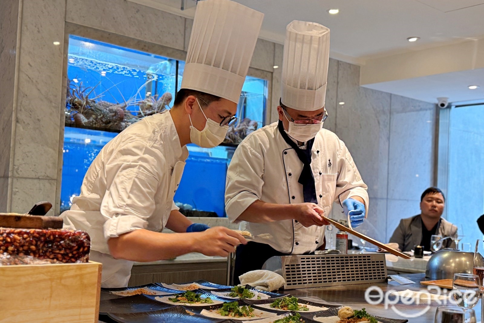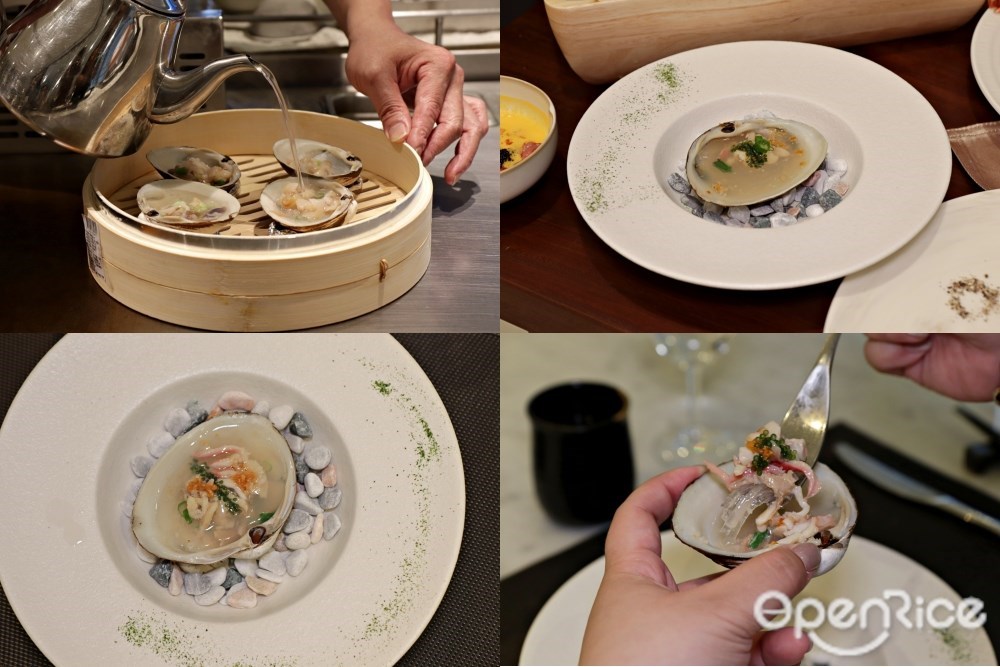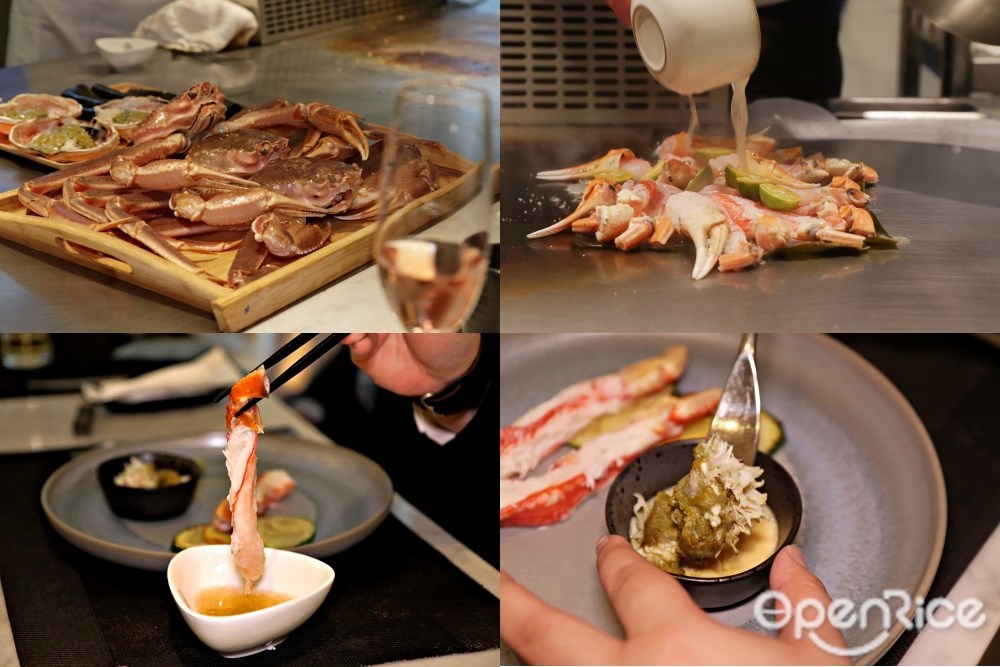 充滿大海滋味的「蒜酥粉絲活北寄貝」新鮮直送的肥美多汁北寄貝滴上檸檬汁、白酒及奶油調味,搭配日本冬粉,及蒜酥最後灑上一點蔥花,口感鮮甜。餐期高潮之一的「北海道松葉蟹 佐蟹膏蒸蛋」終於登場,主廚採用活體北海道松葉蟹,肉質肥嫩飽滿,以日本大昆布及金桔包覆松葉蟹腳鐵板清蒸,保留最原始鮮甜風味,搭配鼎泰豐特製米醋,更能襯托蟹肉的鮮味。