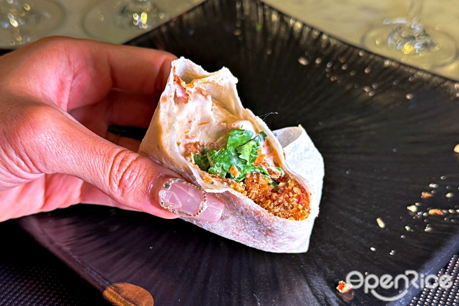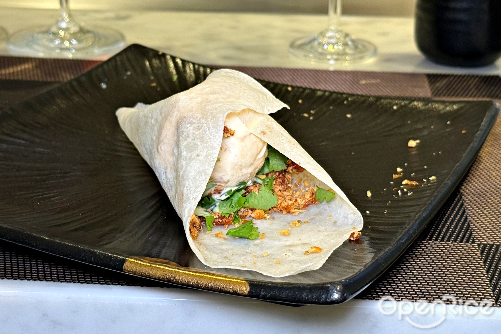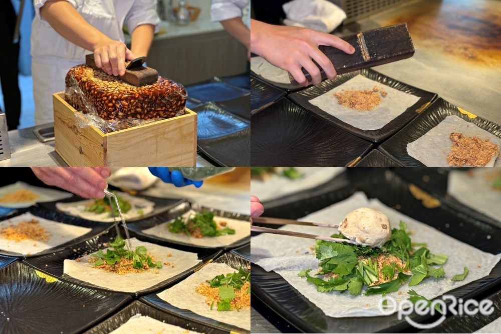 最後還有充滿宜蘭特色的壓軸甜點「潤餅冰淇淋花生捲」,華麗現身鐵板燒席間做為完美結尾!使用宜蘭在地知名「金少爺花生糖」,由師傅現場現刨,也讓席間瞬間花生香氣瀰漫整桌,暖香撲鼻,成為甜點的最佳前奏。搭配古法手工製作、薄韌帶香的潤餅皮,內餡選用 Häagen-Dazs 花生冰淇淋,冷滑濃郁的乳香與現刨花生的溫暖脆香交織出多層次口感;是一道既有童年記憶、又以更精緻方式呈現的宜蘭風味壓軸。