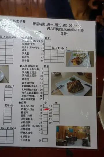 花蓮的素食的店真的不少 對於吃素的人真的很方便 不過吃素的早餐來說 相對的比較少一些 今天跟大家介紹這家就是疏食的早餐店^^ 不過我吃的時間已經是上個月初了XD 完全忘記寫它 今天看到馬上拿出來寫 不過不知道有沒變化 大家就當參考吧店內環境菜單紅茶(小10元 大15元)其實蠻便宜的 不過他們大小杯都是用同一個杯子 小杯就給這樣 大杯就是加滿 雖然說量應該是這樣沒錯 不過給沒滿的飲料...我還是建議直接換個杯子感覺比較好一些 個人感受摟鮮奶(30) 說是進口的 但我不喜歡它的味道招牌什錦米粥(45)喔喔喔看來很好吃 有香菇 素火腿 菜埔 和一個很像是魚酥的東西(當然不會是葷的啦) 增加他的口感還蠻順口的 就是把早餐的配料通通放進白粥裡 不過這樣吃也很方便 簡單好吃手工蘿蔔糕(30)他們的海山醬也是自製的歐姆蛋軟法國吐司 這個還蠻好吃的ㄟ 麵包烤得很酥 配上他們的歐姆蛋和蔬菜 好吃蔬菜蛋餅 店家說他們的皮是自己做的唷裡面蔬菜給的蠻多的 還加了起士 更香濃 這道也蠻不錯的其實我不太分什麼葷素ㄟ 好吃就是好吃 跟葷素沒有關係 好吃就好 這家從早上0600到1230 可以滿足吃素的朋友 有興趣的可以去吃看看唷…Read More