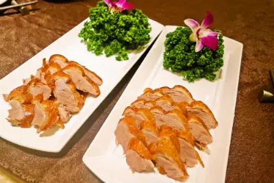 另外,全聚德烤鴨還有一大特色,就是首創的「掛爐烤鴨」,掛在鉤上入爐烘烤,並且選用果木為燃料,讓烤後的鴨帶點果木香。但是由於環保議題的相關政策,對岸也禁止新開店家使用掛爐式的烤爐,所以在長榮鳳凰酒店也是採電烤爐的方式喔!好處是受熱均勻,也不需要花費大量的人力在爐邊,重點是始終保有原來的風味!