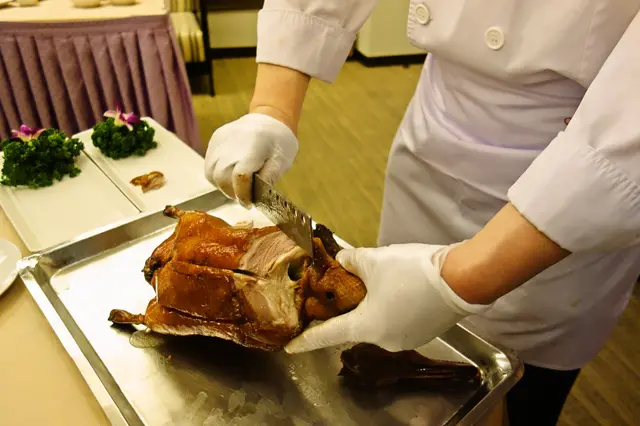 俐落的刀法,酥脆的聲響,預告終於要品嚐期待已久的中國第一烤鴨了!