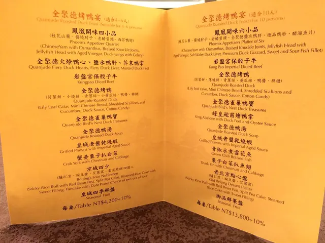 此次全聚德來台,推出兩組桌菜饗宴,分為4~6人/每桌4,200+10%,及10人/每桌13,800+10%兩個方案。從3/1~4/45,為期46天的烤鴨盛宴,如果你老饕又特別偏愛烤鴨,就不要錯過這烤鴨界的LV帶來的完整用餐體驗摟!