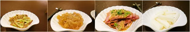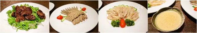 被稱為全聚德冷菜之首的「芥末鴨掌」:聽說這道菜讓廚師們傷透了腦筋,因為每一副鴨掌的骨頭,都是廚師們一根一根拆去的,是一道既費時又費工的料理~一口咬下,口感清脆,搭配北京原汁原味的蜜汁芥末醬,特殊辣味直竄腦門(怕芥末的朋友小心不能太豪邁喔!)