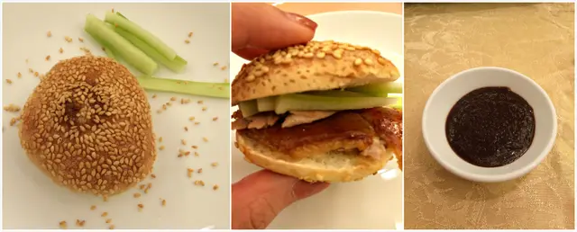 全聚德烤鴨有分「皮肉分吃」、「連皮帶肉」兩種吃法,可以依個人的喜好選擇不同的搭配。