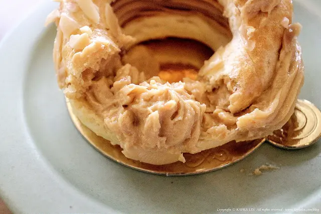 1891年諾曼第的甜點師傅,從巴黎-布勒斯特-巴黎的環型自行車比賽中得到靈感,做出了這個甜點,內餡原本在法國的吃法是用焦糖榛果口味的卡士達醬,而今在臭臉則換上了香濃的花生醬,這花生醬滑順而不甜膩,口感細緻濃厚花生香氣加上杏仁片不甜不膩
