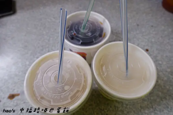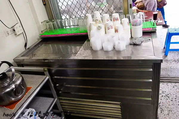飲料檯內是豆漿及奶茶等,內用有時用玻璃杯、有時用碗、有時用紙杯,頗隨興。