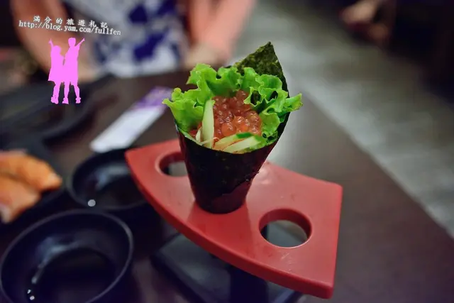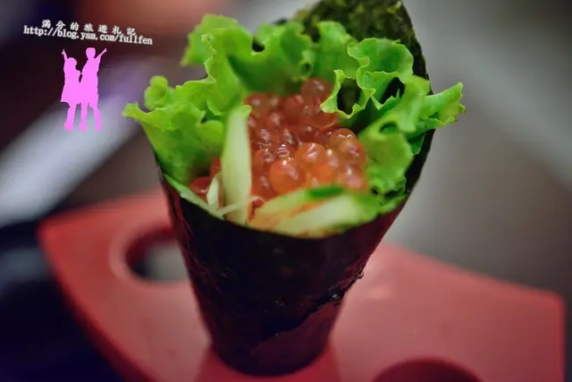 吃手捲的時候要小心嘿,別咬太快,一個不小心鮭魚卵就會全掉在桌上囉