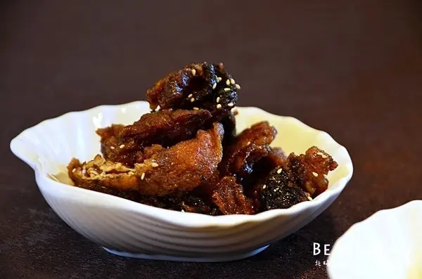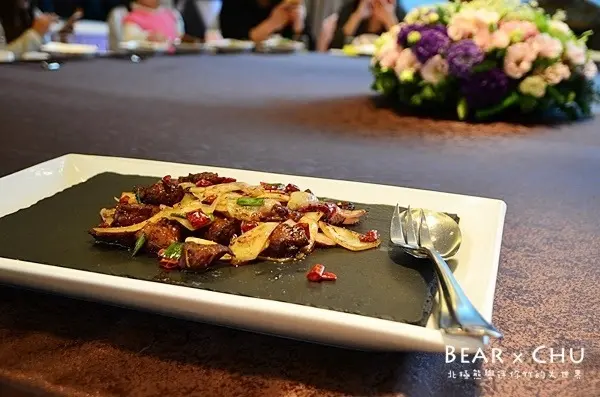岩盤宮保骰子牛鹹香辣很夠味,牛肉熟度掌握得宜口感不錯,對我來說略為偏辣但仍喜愛,全聚德烤鴨宴菜餚感覺略偏甜,唯有這道是比較不同,仔細查了一下發現這道是長榮鳳凰酒店自創的菜色,並非全聚德道地菜色難怪調味上略有差異。
