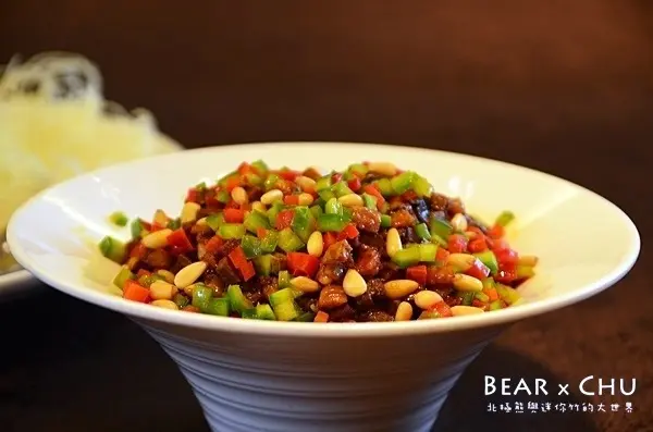 全聚德雀巢鴨寶看起來有點像是蝦鬆的樣式,是把鴨舌等部位切小丁炒香以麵醬調味,還加上彩椒丁與松子增添香氣與口感,吃法是把炸成雀巢的馬鈴薯放到生菜上,再把炒鴨寶盛在上頭,吃起來有多種口感層次,味道上則感覺麵醬滋味略搶風頭了些。