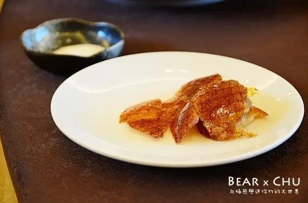 先上桌的是全聚德本店的特別吃法稱作掀蓋,主要是脖子和鴨胸之間的薄皮,這個部分考過特別香脆,旁邊搭著的小盤是白糖,這鴨皮很不同的是要沾糖吃,聽到時感覺同桌大家都驚奇了一下,試了試白糖的田和鴨皮油脂在嘴裡融化,是種意外的美妙。