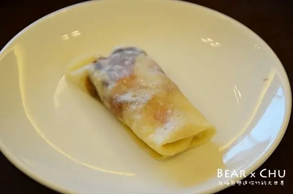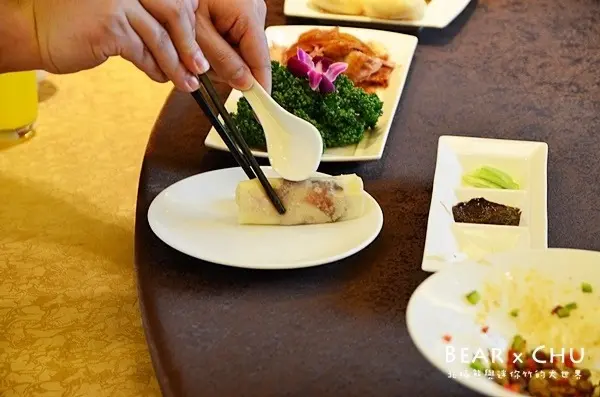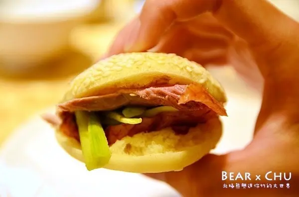 最後乾脆示範如何用荷葉餅包起烤鴨,一塊餅大概包四、五塊鴨肉,沾點鴨醬後在擺上青蔥和黃瓜絲,再包起來就能品嘗,只能說專業的就是厲害,包起來真是整齊又好看,這荷葉餅口感還不錯稍帶彈性,烤鴨油脂和風味在嘴裡擴散實在很享受,多了黃瓜則是增加口感和清爽。