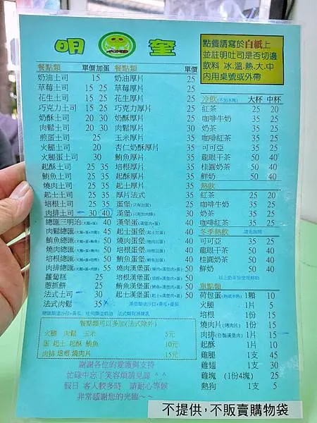 明奎早餐店內Menu:餐點的選擇多樣化,有厚片、吐司、三明治、蘿蔔糕、飲料……等,來到明奎一定要點份店內招牌:就是淋上煉乳的法式吐司,餐點價位可說是銅板美食,點餐方式很特別也就是要拿一張小紙條,自己把要點的餐點品項寫在紙上再交給店員,等待店員確認後,就可以付錢囉…