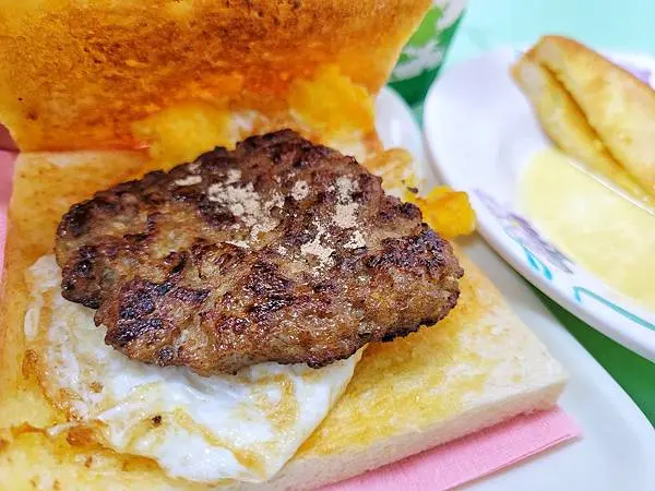 肉排吐司+蛋:吐司外皮酥酥脆脆,梅子喜歡肉排不澀不乾的口感。