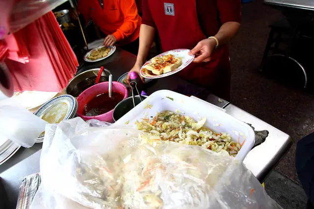 攤頭的店員,一個負責狂炸擺盤,一個負責淋汁打包,動作井然有序十分流暢