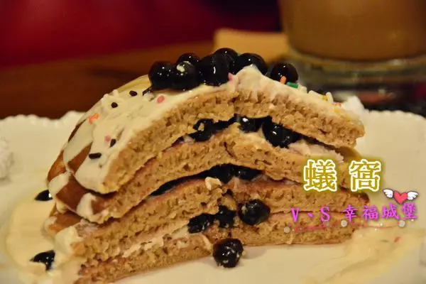 看看這鬆餅是不是好誘人,一旁的奶霜綿密細緻,粒粒分明的珍珠閃閃動人著、色彩繽紛的巧克力米分佈在整個鬆餅上。