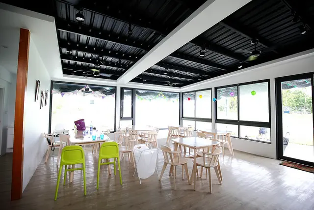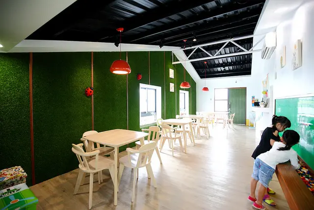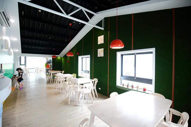 另外一邊的用餐區,配色就比較豐富了,綠色的綠草牆加上木製的桌椅,還蠻有森林小屋的FU