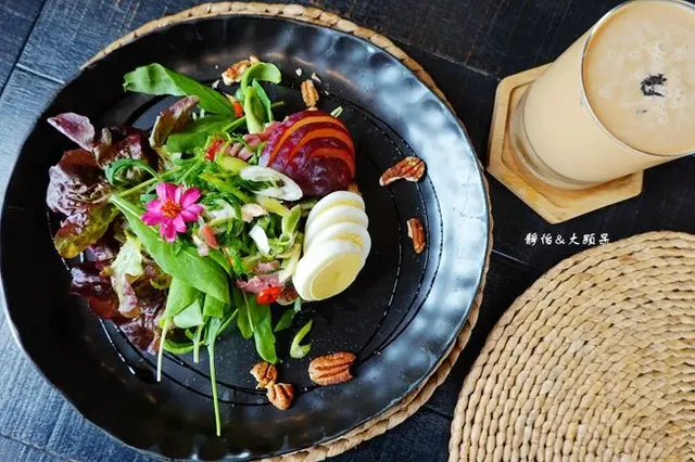 【蒔花咖啡】走精緻路線,餐點份量不多,但擺盤設計美美的,這盤三明治端上桌時會讓人有"不是點三明治嗎!?怎麼變成生菜沙拉了"的錯覺,原來這就是開放式三明治的意思,說真的我還是第一次見到,一大片吐司直接鋪在盤子上,再擺放宜蘭在地煙燻鴨賞、濃郁芝麻葉、香甜蜜桃、白煮蛋切片及切碎核桃等
