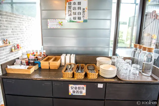 這邊不收服務費,餐具、醬料、杯水都是自取。