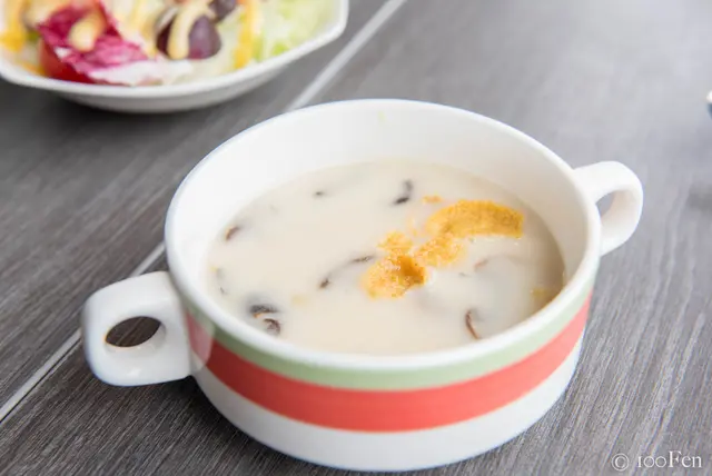套餐附贈的濃湯,裡面有香菇和脆片(如果是麵包丁感覺會比較搭) 喝起來偏濃,感覺勾芡不少