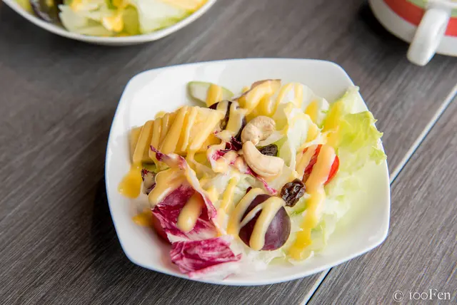 沙拉的內容物還蠻多樣化,有生菜、水果、葡萄乾和堅果,上面淋了類似蜂蜜芥末的醬,味道頗甜