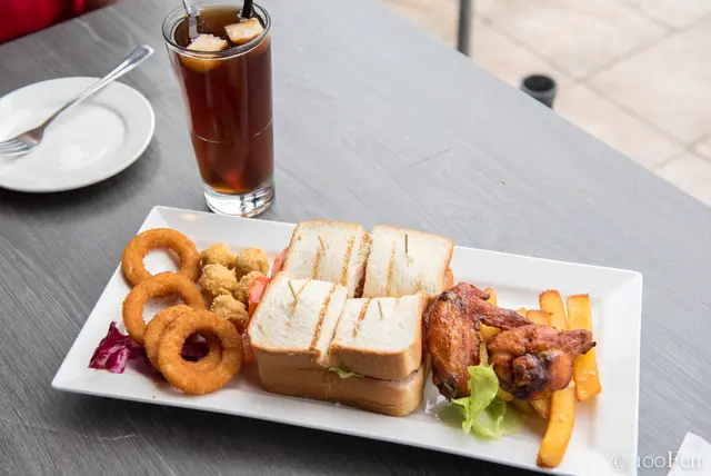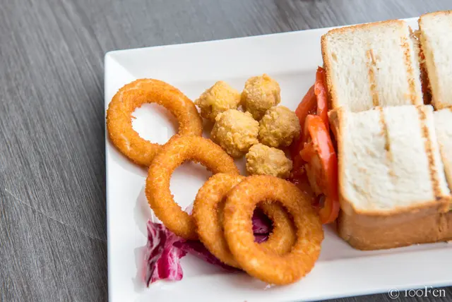 旁邊的配菜也很豐富,包含雞翅、薯條、洋蔥圈及雞米花。雞翅和薯條好吃,薯條是甜甜的地瓜薯條。洋蔥圈皮厚了點,吃起來比較空虛。