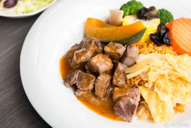 這道拌烤飯適合想吃正餐的朋友,嚴格來說比較像是拌飯,骰子牛淋上蘑菇醬,飯可以搭配一旁的泡菜品嚐,旁邊還有些蔬食點綴。骰子牛我覺得本身調味很淡,肉質尚可,不至於難嚼過老。拌飯還蠻香的,但是吃起來微乾,建議搭配酸酸的泡菜~旁邊的南瓜、花椰菜、木耳等等都沒什麼調味,不沾著醬吃真的超清淡。