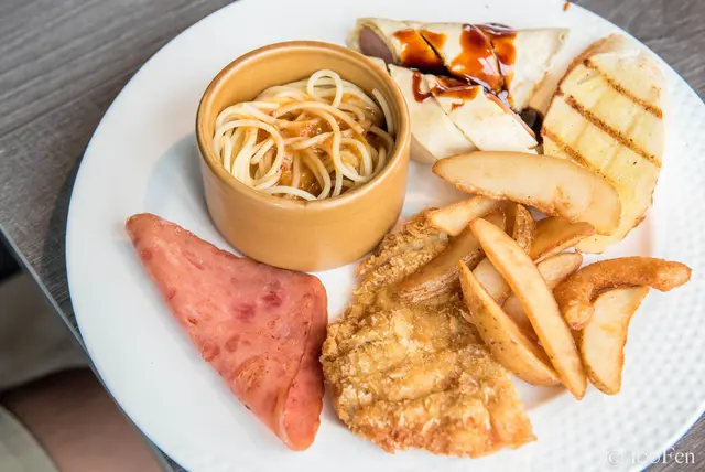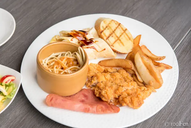同行另外兩位友人點的都是「早午餐」,一份是卡啦雞、一份是炸豬排。老實說兩樣都是皮大於肉,吃來乾硬不出色...其他配料更是令人錯愕!原本菜單上寫的義大利麵,是一碗水煮麵淋上醬;墨西哥餅捲是熱狗蛋餅淋上醬油膏,非常突兀的搭配。簡而言之大家吃完這道都不推。