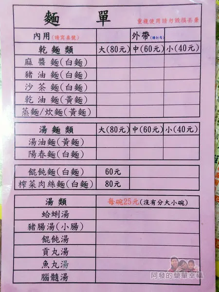 麻醬麵(小)、炊麵(小)、蛤蜊湯、宜蘭粉腸、豆腐碰仔、豬肉捲