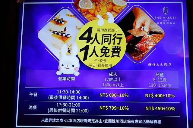 晚餐:成人NT$ 799 + 10% 元/人、兒童NT$ 450 + 10% 元/人