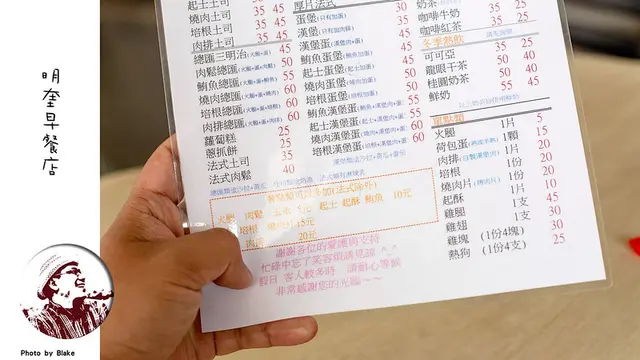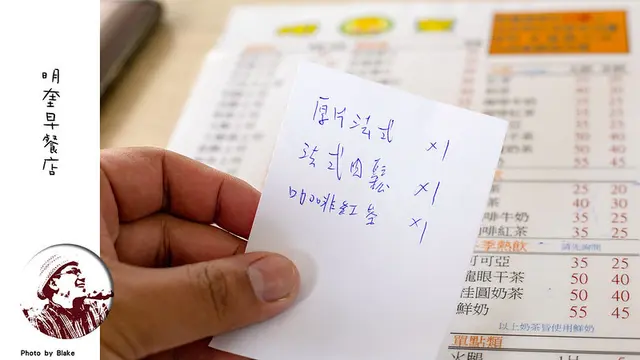 明奎早餐菜單可以看得出來它們家是以吐司類為主,有分成一般吐司跟厚片吐司,而且都有做甜的跟鹹的味道,再來就是漢堡跟飲料等等,另外也有當地人介紹說明奎早餐菜單上的炸雞炸雞翅也不錯,這次沒點到只好下次再來試試看,點了一個招牌的法式肉鬆跟厚片法式,點餐方式比較特別不是劃在明奎早餐菜單上面,而是寫在紙條上面點餐。