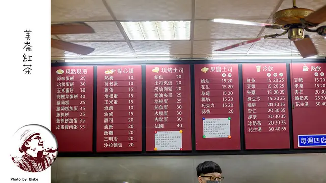 《美崙紅茶》沒有美崙紅茶菜單,就只有價目表在餐台後面,點餐方式就跟一般傳統豆漿店一樣,就跟餐台走,邊看邊點餐,裡面賣的早餐有蛋餅、點心與吐司,還有一些冷熱飲,點心竟然還有壽司跟米糕,也是很特別,價格都是50元以下的銅板價,消費還蠻便宜的啦!