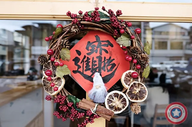 門上的花圈帶有點紅色裝飾來增添代表新年的喜氣