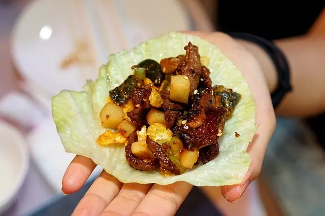 把鴨肉絲放上萵苣上一起吃,一入口 鴨肉味道香而不膩,而且真的有一股特別的味道ㄟ,我跟同行的朋友猜了好久,後來等了主廚過來,一問才知道是加了皮蛋啦,原來如此啊! 第一次吃鴨鬆裡加皮蛋,這味道真是不一樣,而且加了筍塊和玉米脆片下去真是搭,不但增加了2種不同的口感層次之外,筍塊的清爽和玉米脆片的微甜香,更添加味道的豐富度唷