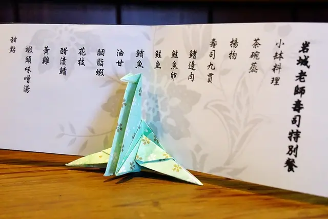 今天我們吃的的是岩城老師特別餐,不得不說,連菜單都很用心,除了寫了我們今天吃的每一樣食物之外,以紙鶴當做固定菜單的小工具,既實用又美觀,在小地方都能看到他們的細心