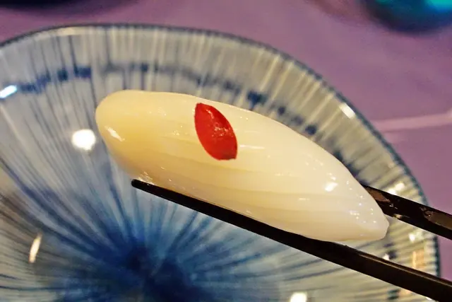 花枝握壽司 花枝肉厚,上切條紋讓他更好入口,而上面那個花瓣是使君子花,這是一種中藥,會帶一點點的甘。岩城師傅很喜歡用不一樣的東西來搭配他的食材^^