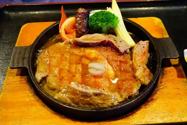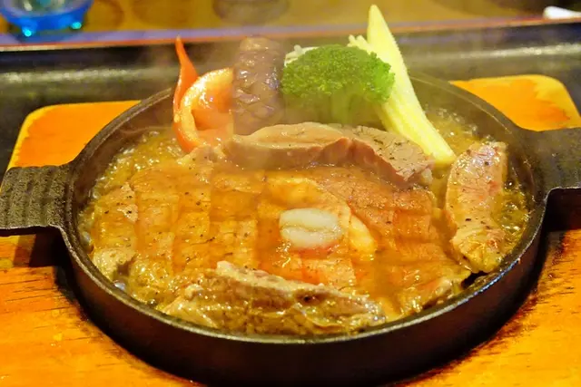 一上桌馬上就淋上日式醋醬油,建議馬上就要吃喔,他剛上桌約是三分熟,但因為鐵板是有溫度的,熟度是會增加了,太熟的牛肉就不會這麼好吃了