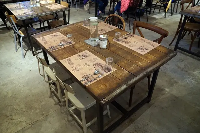 入坐之後 聽著他們的人說 他們的桌子 可是很有故事的 這是古時歐洲地區的建築模板 因為現在工法的改便 已經沒有再用這個了 但是木板本身還非常好 恆好就從歐洲進口回來 加工打磨後來給大家使用 大家可以仔細觀察 他們美一張桌子和每一張椅子都是不一樣的喔