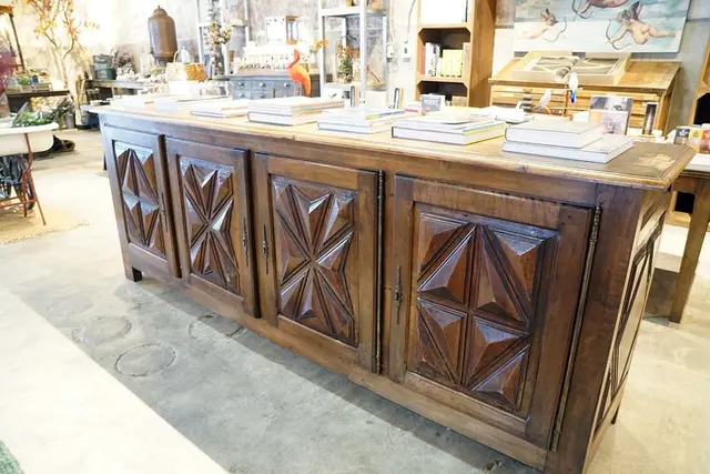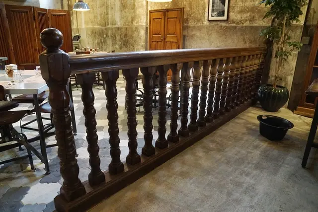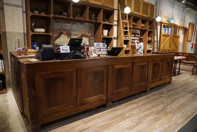 而他的木製櫃台 單看我們覺得他是一個雕工很細緻木櫃 一問才知道 這居然也是百年歷史的木櫃 他原來的擁有者是法國某一區的區工所所有 他們好不容易才輾轉取得 而地上一個一個洞 都是日據時代酒甕壓過的痕跡 恆好覺得這個是這個建築物他本身的記憶 就把他留下 讓來的客人一起參與這個建築物的歷史