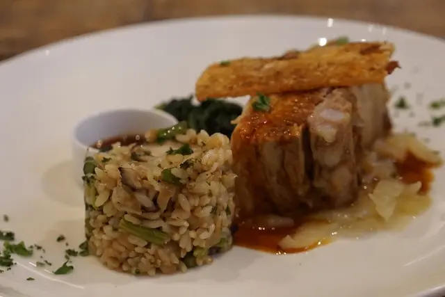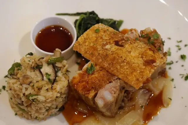 脆皮油封豬五花(299元)主廚選用花蓮在地的溫體豬肉 西班牙炒飯 豬皮主廚另外處理 看起來極酥啊