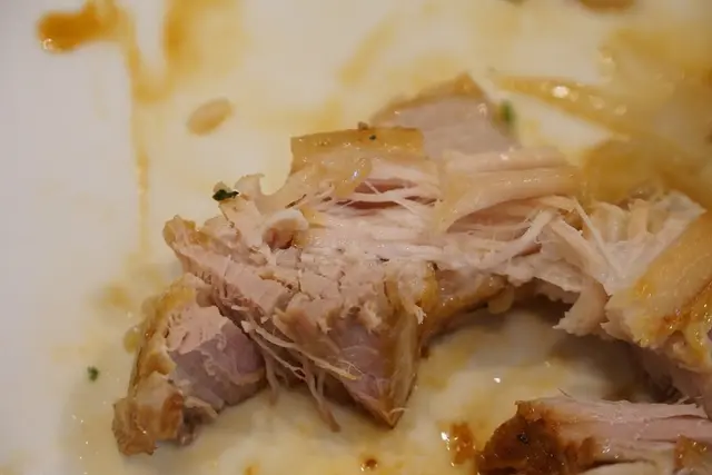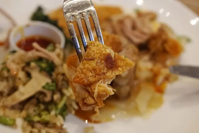 豬皮超級酥脆 一口咬下就跟吃餅乾一樣"卡滋卡滋" 我夾著豬皮 洋蔥配著肉一起吃 嗯??沒什麼味道? 只有一點點微鹹??沾醬來吃看看 喔喔喔 醬汁好味啊 沾醬之後味道好好吃 落差非常大! 濃郁微甜滋味豐厚的醬汁搭配著溫體豬加了一點鹽下去烘烤之後所產生的好滋味 入口帶些嚼勁與炸至極度酥脆的豬皮他所產生的油香滋味 味道迷人啊 但是這樣味道的來源沾醬另外放好嗎 這樣第一口的印象如果不好 會影響接下來吃的感受啊