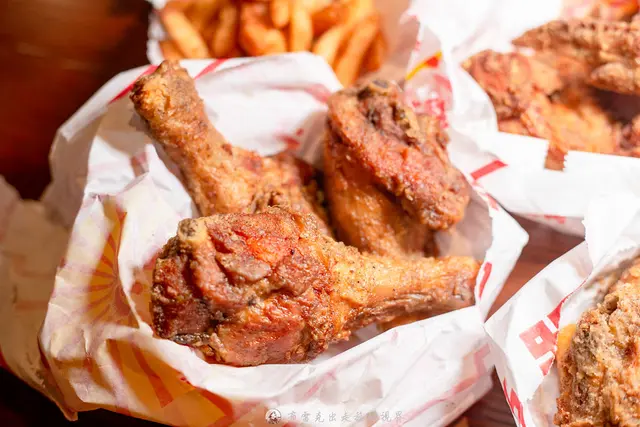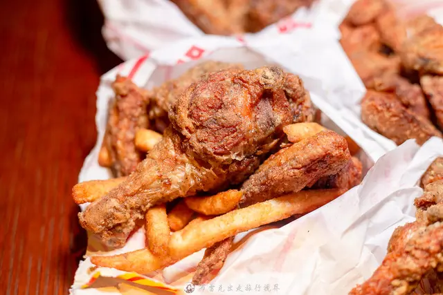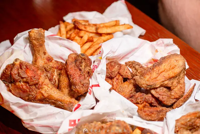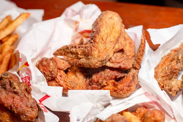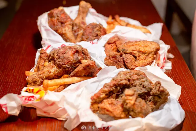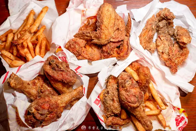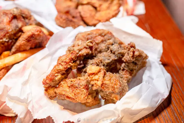我們是四個人來買,全家餐是配三套雞腿+雞翅,所以就在加一份炸雞餐,那就有四套雞腿+雞翅,《阿鋐炸雞》炸雞餐不像是肯德雞那種就是它們搭給你,這邊就是雞腿加雞翅一套,另外還有薯條跟雞塊,雞塊不是我們認知的那種炸雞塊,像是三角骨或帶骨的雞肉塊,咬起來脆脆的,本身就有一點鹹度,即使不加胡椒也好吃。