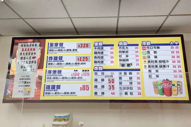阿鋐炸雞菜單上賣的跟藍蜻蜓真的有87分像,都有漢堡跟炸雞,就是不像是炸雞攤,反而像頂瓜瓜那種台式炸雞速食店,而且兩家炸雞餐的價格幾乎也都是一樣,像是炸雞餐就是125元,都有兩塊炸雞配薯條跟雞塊還有飲料,但這邊的雞塊不是我們熟知的麥克雞塊,比較像是鹹酥雞那種。