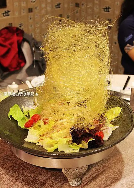 用糖絲做成的龍捲風一端上桌成功的引起一陣驚呼,金色的絲線好貴氣,噱頭十足!