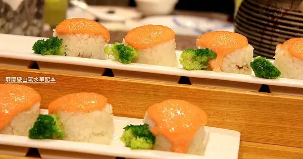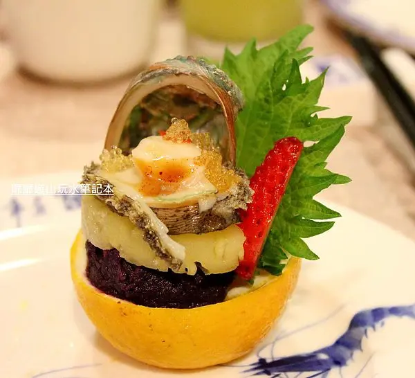 每一份都有台灣小鮑魚、草莓、柳橙、飛魚卵醬、鳳梨、紫地瓜跟紫蘇葉,顏色很鮮豔討喜~