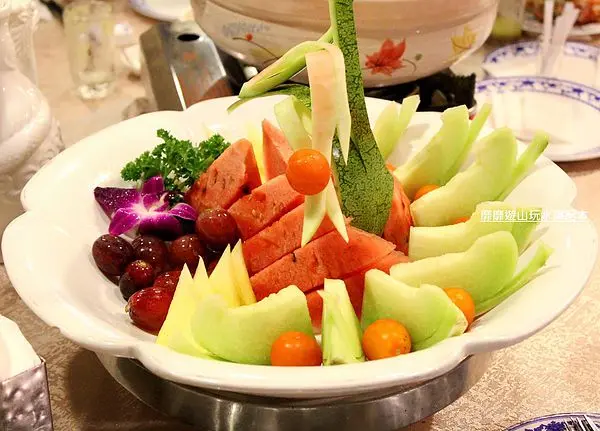 水果拼盤裡有西瓜、葡萄、鳳梨、香瓜、番茄,是品質很不錯內容又豐富的水果盤!