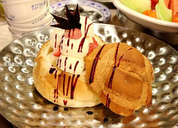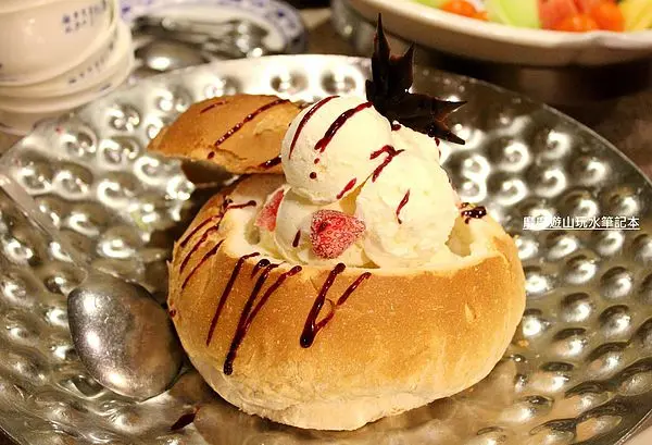 大大的麵包碗裡裝滿了奶酪再放上一人一球的冰淇淋,造型很可愛~
