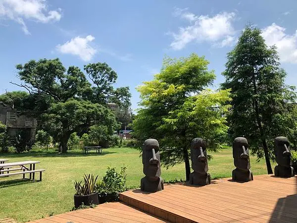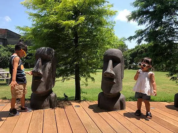 門口招牌吸睛的摩艾石像們