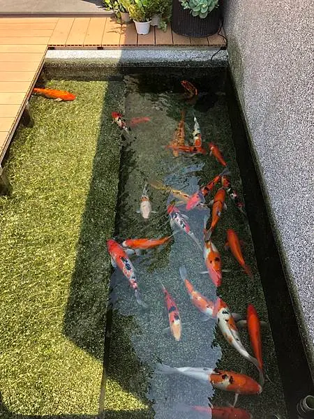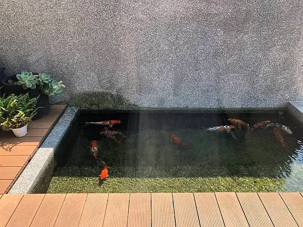 戶外有一小片綠地和小魚池