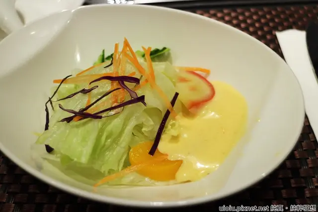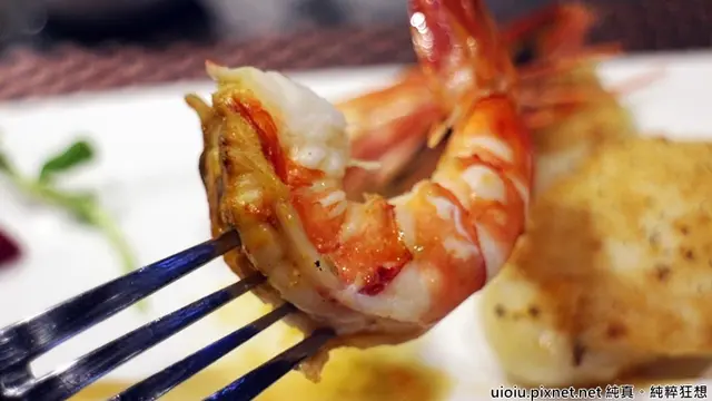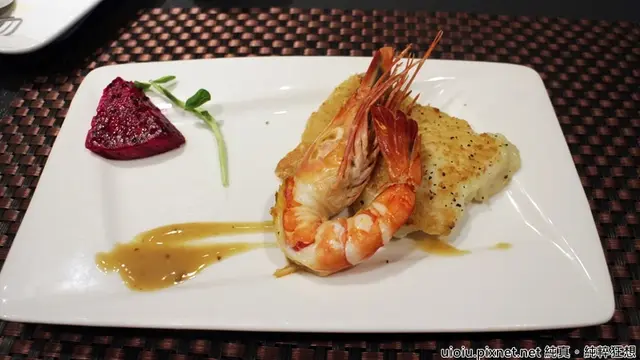 草蝦吃的出來有新鮮,肉質紮實,咬起來彈牙,旁邊裝飾的醬汁是芥茉籽醬,沾上一點可以提味,吃起來口感會不同哦!