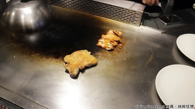 莉格鐵板燒的雞肉選用溫體雞,吃起來肉質就不一樣,而且鐵板現煎鎖住雞肉原味,切開來都看到滿滿的雞汁呀!(好誘人~)